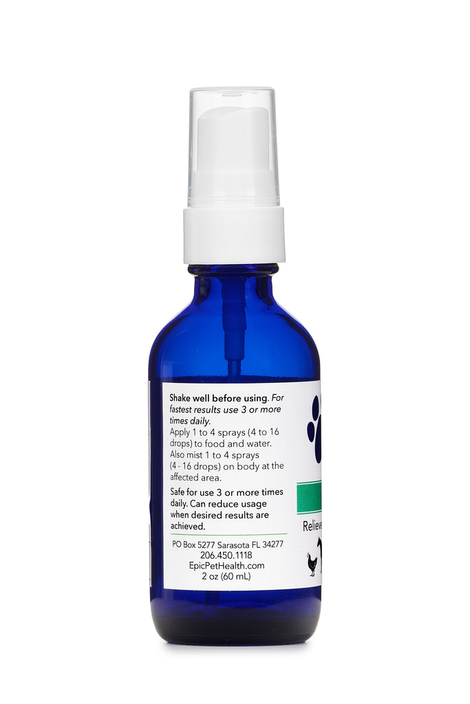 Directions: Use two sprays or 10 drops on food and water once daily. Apply to stomach area on body once daily.